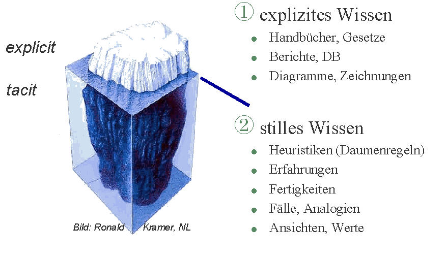 Die in Fig. 2 verwendete Metapher des Icebergs will veranschaulichen, dass das explizit vorhanden Wissen nur ein kleiner Anteil dessen ist, was [in einer Person] in stiller Form vorhanden ist. Eine weitere Metapher [für das Verhältnis zwischen stillem und expliziten Wissen] die für mich z.Z. wichtig ist, ist die des Schattens. Im Beispiel der Frage von vorhin: die formulierte Frage ist für mich wie der Schatten der Frage im Kopf.
