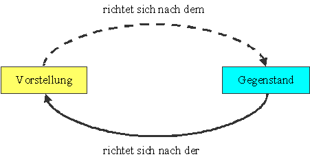 Ich kann die Stelle in der 'Kritik der reinen Vernunft' suchen ....., hier, es ist B XVI: "Bisher nahm man an, alle unsere Erkenntnis müsse sich nach den Gegenständen richten ...". [Das ist in Fig. 3 mit dem oberen Pfeil von Vorstellung nach Gegenstand dargestellt]. Die Erkenntnis - also die Vorstellung - richtet sich nach dem Gegenstand. Die Beziehung sagt Kant wurde bisher - das war 1787 als die zweite Auflage der Kritik publiziert wurde - in dieser Weise betrachtet. Und das ist heute immer noch so auch in der Wissenschaft. Man geht davon aus, dass unser Wissen als Abbild von etwas Vorgegebenem entstehe. Dann fährt Kant an der Stelle weiter indem er sagt, dass es verschiedene Probleme damit gibt und macht den folgenden Vorschlag: "Man versuche es daher" - wegen der Probleme - "einmal ob wir nicht in den Aufgaben der Metaphysik damit besser fortkommen, dass wir annehmen die Gegenstände müssen sich nach der Erkenntnis richten". ..." [in Fig. 3 mit dem unteren Pfeil von Gegenstand nach Vorstellung dargestellt]. Das ist die berühmte 'Kopernikanische Wende'.