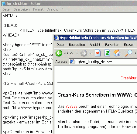 Man hat also eine Datei, die man - wie in nebenstehender Abbildung gezeigt - entweder im Editier-Programm (ein gewöhnliches Textbearbeitungsprogramm) oder im Browser betrachten kann.