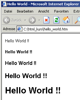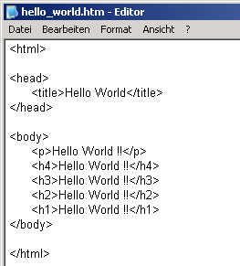 Innerhalb der <body>-Klammer steht der einige Male der Text "Hello World", einmal ohne tag-Klammer und ein paar Mal mit verschiedenen <h>-Klammern. Wie Sie bereits gesehen haben, wird im Browser nur der Inhalt der <body>-Klammer angezeigt. Die verschiedenen <h>-Klammern bewirken verschiedene Schriftgrössen. Die <head>-Klammer sieht man nicht, den Inhalt der <title>-Klammer - hier "Beispiel" - sieht man (nur) auf dem Rahmen des Browsers.