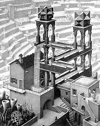Jede Maschine hat eine spezifische Funktion, während jede Kraftmaschine als Motor aussschliesslich die Funktion hat, eine Maschine anzutreiben. Eine anschaulliches Element einer Kraftmaschine ist das Wasserrad. Damit sich das Wasserrad bewegt, muss Wasser fliessen. Wasser fliesst - im Prinzip - nur "abwärts". Es gibt eine aber eine spezifische Inversion, die als Perpetuum mobile bezeichnet wird. Und praktisch gibt es die Möglichkeit, das Wasser wieder hochzutragen, damit es erneut abwärts fliessen kann. Das wird effektiv (wenn auch nicht effizient) bei vielen Stauseen gemacht. Das Wasser wird hochgepumpt und fliesst dabei in der Leitung aufwärts in einen höhergelegenen Stausee hinauf, damit es später wieder runterfliessen, also ein Wasserrad antreiben kann. C. Escher hat das schön ver-zeichnet. Ich weiss vom Wassertragen, dass es für mich umso mehr "Arbeit" ist, je mehr Wasser ich je höher tragen muss. Ich kann das Wasser im Eimer in den Stausee tragen. Ich kann zählen, wie viele Eimer voll Wasser ich zum Stausee trage. Ich kann messen, wie viele Kilogramme ich um wieviele Meter emportrage. Ich werde bei dieser Arbeit müde. Wenn ich eine entsprechende Maschine habe, kann ich das Wasser mittels der Maschine in den Stausee hoch pumpen. Die Pumpe ersetzt dann meine Tragarbeit. Ich kann dann sozusagen - die Physiker sagen es idiotischerweise so - die "Arbeit" der Maschine messen. Natürlich arbeiten Maschinen nicht, Menschen arbeiten mittels Maschinen. Aber wenn ich mit einer Maschine arbeite, macht die Maschine bestimmte Dinge, die ich dann nicht "von Hand" machen muss. Die Maschine wird nicht müde, weil sie nicht arbeitet. Die Kraftmaschine ist ein Mechanismus, der von sich aus natürlich nichts leisten kann. Die Pumpe angetrieben werden, das kann ich mit einem Wasserrad tun. Dabei verwende ich Wasser aus einem Stausee dazu, Wasser in den Stausee hoch zu pumpen. Man mag entdecken, dass sich dabei der Stausee leert, weil die Wassermenge nicht genügt, um eine gleich grosse Wassermenge hoch zu pumpen. Abstrakt - im Sinne eines Perpetuum mobile - aber kann ich sehen, dass das abwärtsfliessende Wasser gerade reicht um gleich viel Wasser hinauf fliessen zu lassen. Für ergeben sich zwei Pseudo-Fragen. Einerseits warum funktioniert das Perpeduum mobile nicht und andrerseits, wie kommt das Wasser in den Stausee, wenn ich es weder hochtrage noch hochpumpe? Dass das Perpeduum mobile nicht funktioniert, ist eine Erfahrungs-Tat-Sache. Ich habe einfach noch keines gesehen. Ich kann diese Erfahrung rationalisieren, indem ich Energie physikalisch auffasse und einen Wirkungsgrad einführe, durch welchen einen Teil der Energie verloren geht. Ohne Physik und ohne den Ausdruck Energie kann ich aber eben empirisch und experimentell erkennen, dass ich arbeiten zusätzlich muss, wenn ich das Wasser des Stausees über ein Wasserrad, das eine Pumpe antreibt, dazu benutze, den Stausee mit Wasser zu füllen. Wie aber kommt das Wasser in den Stausee, wenn ich es weder hochtrage noch hochpumpe?Meine Erfahrung sagt, durch Regen, der sich in Bächen sammelt und "abwärts in den Stausee fliesst. Der Regen kommt aus den Wolken, aber wie kommt er in die Wolken? Wie fliesst das Wasser da hinauf? Ich bezeichne das Phänomen als Verdunstung von (Meer)wasser und postuliere damit eine Wasserverdunstungsmaschine, die angetrieben werden muss. Die Wasserverdunstungsmaschine stelle ich mir in einer Analogie zur Dampfmaschine vor. Die Dampfmaschine ist sozusagen der Urtyp der eigentlichen Antriebsmaschine, man sie hinstellen, wohin man will, während Wasserräder einen Bach brauchen. Die Dampfmaschine wird beispielsweise mit Kohle geheizt. Ich muss also Kohle herbeischleppen und verbrennen und habe dann ein sich drehendes Rad wie beim Wasserrad. So erziele ich mit Kohle dieselbe Wirkung wie mit Wasser aus dem Stausee. Ich kann mit einer bestimmten Menge Kohle also eine bestimmte Menge Wasser in den Stausee bringen. Und so erkenne ich den Mechanismus, mit welchem ich durch Wärme Wasser in die Höhe transportieren kann. In einer Analogie, die ich noch etwas ausformulieren müsste, kann ich sehen, dass die Sonne die Wärme liefert, die Wasser vom Meer in den Stausee hinauf transportiert. Schliesslich kann ich mich fragen, warum das Wasser abwärts fliesst, wenn ich weiss, dass es für das aufwärts fliessen eine Maschine braucht. Eine Art Antwort oder eher Umformulierung der Frage gibt die Physik). |