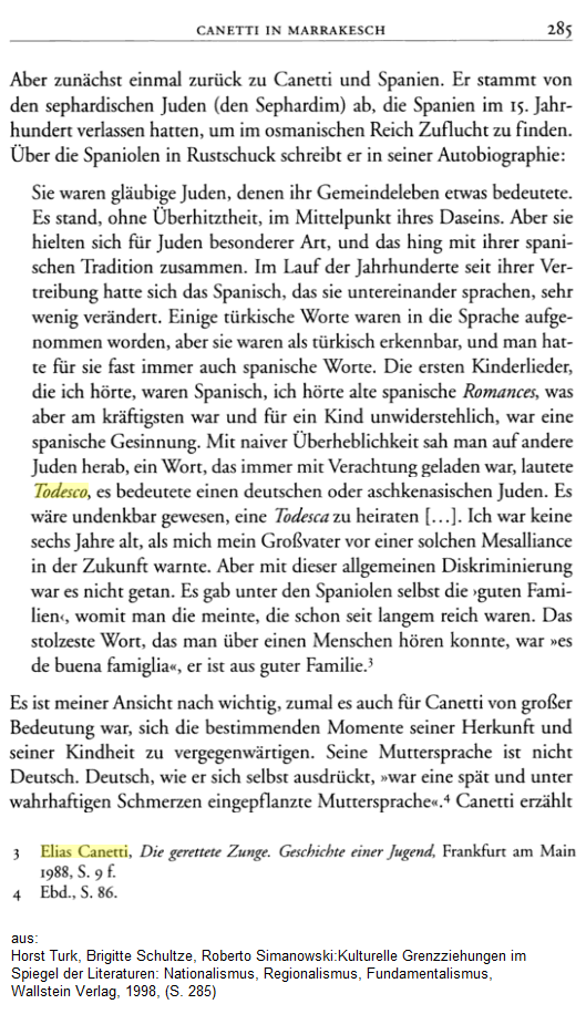 Elias Canetti, der im bulgarischen Rustschuck als Sohn sephardischer Eltern geboren war, schrieb in seinen Jugenderinnerungen: "Mit naiver Überheblichkeit sah man auf andere Juden herab, ein Wort, das immer mit Verachtung geladen war, lautete 'Todesco', es bedeutete einen deutschen oder aschkenasischen Juden" (mehr mit Quelle)