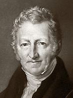 Thomas Robert Malthus (1766-1834) war ein britischer Ökonom, der zu den Vertretern der klassischen Nationalökonomie gezählt wird. Er war Inhaber des weltweit ersten Lehrstuhls für politische Ökonomie, welcher 1805 am College der East India Company im englischen Haileybury eingerichtet worden war. Die in „An essay on the principle of population“ enthaltenen Überlegungen zum malthusschen „Bevölkerungsgesetz“ regten Charles Darwin zur Übertragung dieser Ideen auf das Zusammenleben der Spezies in der Natur und somit zur Entwicklung der Evolutionstheorie an. |