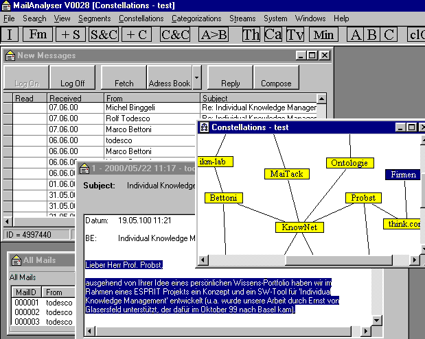 Mit der Idee eines Wissens-Portfolio verbinden wir überdies eine Form von explizitem Wissen, wie sie sich in einer Liste von Kategorien niederschlagen kann. Die Constellation gibt leicht lesbar Auskunft über die Themen, die mich beschäftigen, weil sie als Metatext ein eigenständiges Dokument darstellt. Ein zentrales Motiv für MailTack war ja gerade das quasi automatisch anfallende kategoriale Wissen, das der Benutzer aus der Spiegelung seiner Tätigkeit gewinnen kann. Natürlich generiert jeder Benutzer von MailTack auch Wissen darüber, wie MailTack verbessert werden könnte, aber dieses konstruktive Wissen bleibt ohne bewusste Explikation implizit, weil der Benutzer das Programm "MailTack" nicht verändern kann.