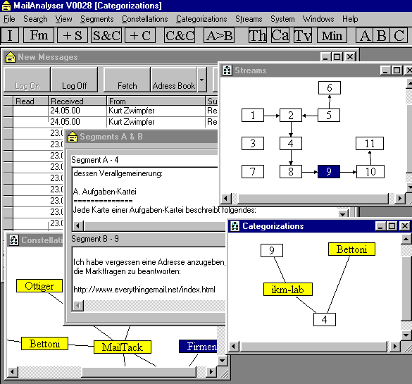 Während ich ein Mail lese, markiere ich mit dem Cursor das Textsegment, das mir in einem spezifischen Zusammenhang wichtig scheint. Bei vielen Mails markiere ich natürlich gar nichts. Dem markierten Textsegment kann ich eine oder mehrere Kategorien zuordnen, die ich in einem Fenster, in welchem meinen Kategorien und deren Verknüpfungen graphisch dargestellt sind, auswähle.