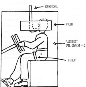 Ein „schwerwiegendes Problem ist das der Zentrifugalkraft. Wenn unser Fahrer - verspiegelt - nach rechts fährt, wird er sich zu seiner Überraschung mehr zur Innenseite der Kurve als nach außen gedrückt fühlen, ein höchst unangenehmer und verwirrender Eindruck. Wie bei Columbus und dem Ei ist die Antwort ganz einfach, sobald man sie kennt. Wenn wir eine Masse in eine Flüssigkeit höherer Dichte eintauchen, verhält sie sich, als ob sie ein negatives Gewicht hätte. Die Flüssigkeit presst das Objekt in Richtung der Beschleunigung.“ (320) Also muss der merikaner-in-England in seinem Wagen in einen „Taucheranzug“ gesteckt und dann in einen „Behälter“ gesetzt werden, der mit einer solchen Flüssigkeit gefüllt ist: Natürlich würde er dazu neigen, nach oben zu steigen, aber der Gurt hält ihn unten. Ein Schnorchel sorgt für seine Atmung, und so fühlt er sich alles in allem, inmitten der diversen Gerätschaften, ganz wie zu Hause in Amerika!“ (Anmerkung: Diese Auszüge von Shannons Text habe ich in nicht zitierbarer Form von Lehmann 2005 übernommen). |