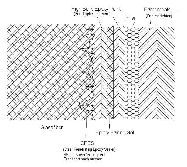 Vor der Applikation des Sealers wird die durch Osmose beeinträchtigte Oberfläche von den alten Deckschichten wie Lacken und Füllstoffen bis auf die Grundstruktur durch mechanisches Abtragen frei gemacht. Darauf wird der alkoholhaltige CPES Clear Penetrating Epoxy Sealer aufgetragen. Dieser dringt in die Glasfaserstruktur der Hülle ein, wobei das Lösungsmittel des Sealers mit dem Wasser "azeotropische Gemische" mit relativ tiefem Siedepunkt bildet. Dank der speziellen Charakteristik dieser Gemische wird das in die Glasfaserstruktur eingedrungene Wasser beim Verdunsten des Lösungsmittels mitgerissen.